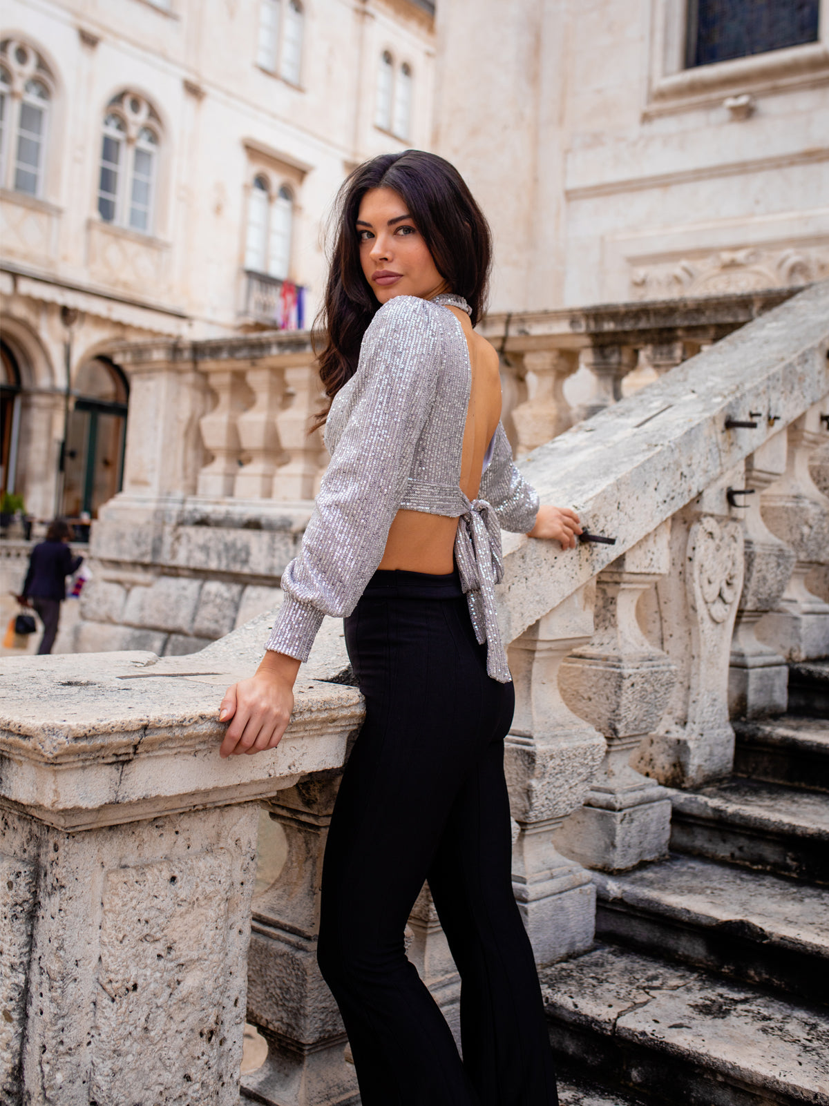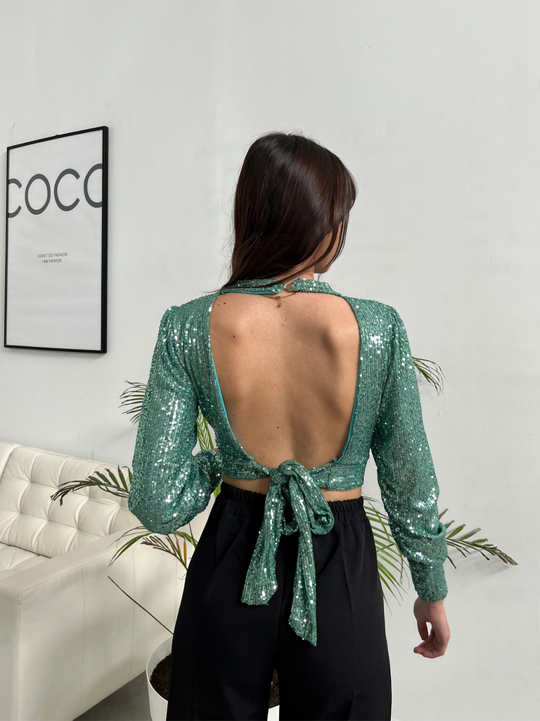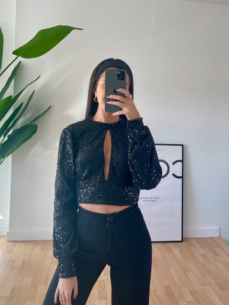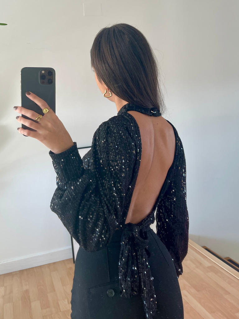 Top lentejuelas de fiesta para navidad, fin de año o nochevieja. Tiene un escote con abertura que lo hace ideal, la manga abullonada y una maravillosa espalda abierta con lazada. Nos parece brutal para llevarlo en nochebuena, nochevieja o fin de año.
