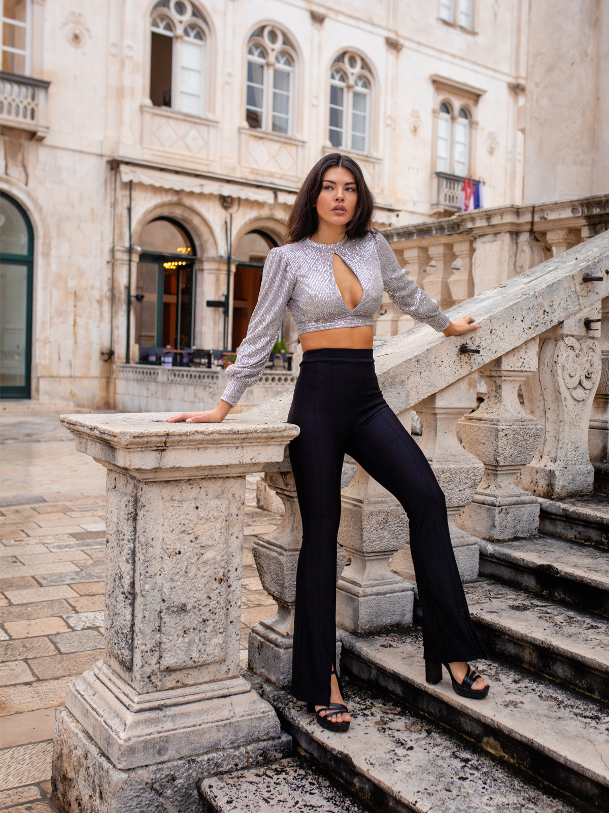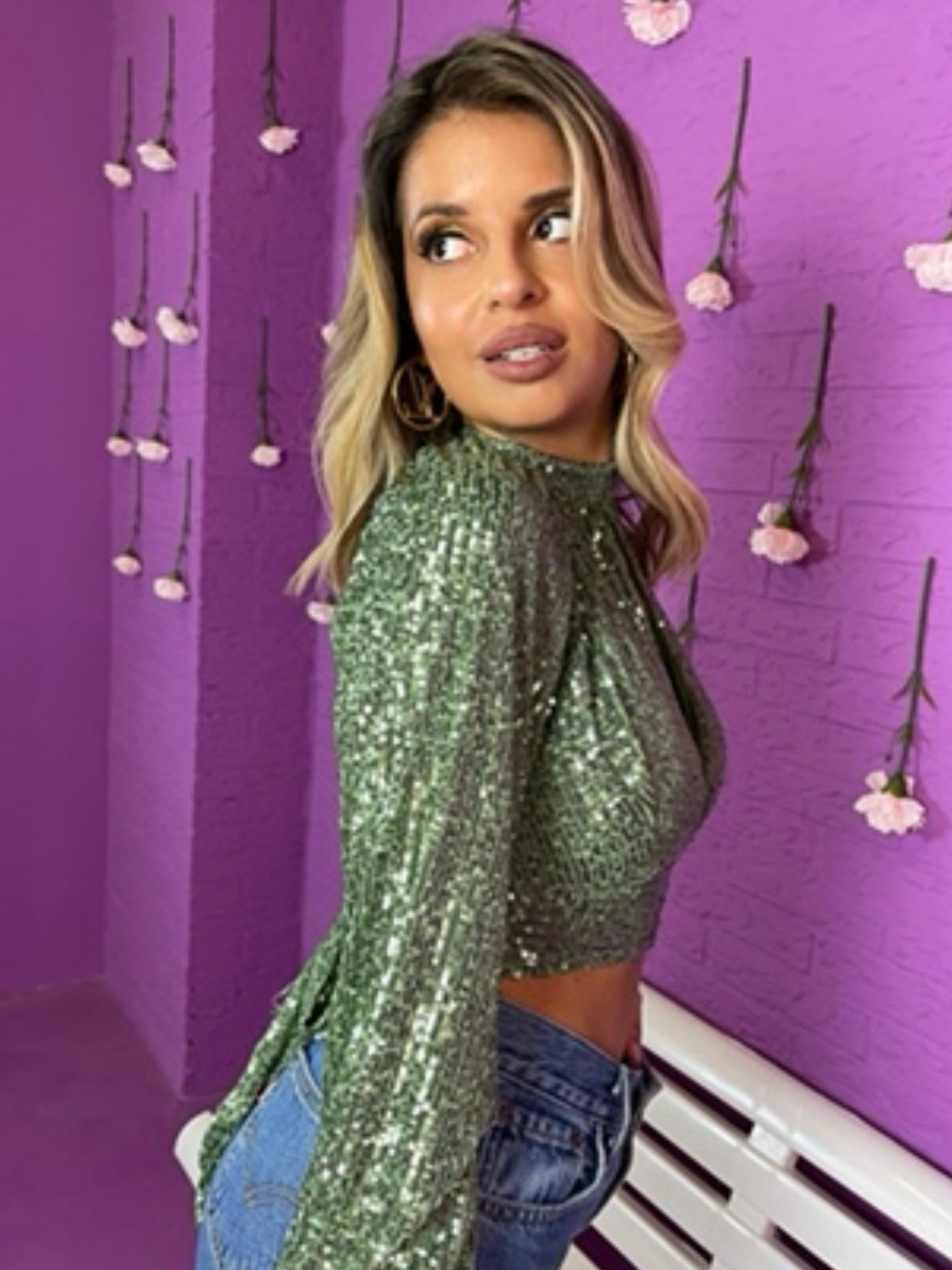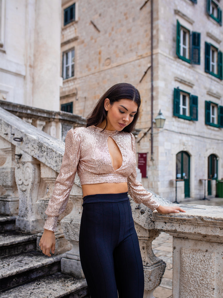 Top lentejuelas de fiesta para navidad, fin de año o nochevieja. Tiene un escote con abertura que lo hace ideal, la manga abullonada y una maravillosa espalda abierta con lazada. Nos parece brutal para llevarlo en nochebuena, nochevieja o fin de año.