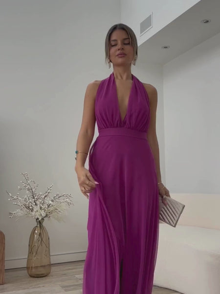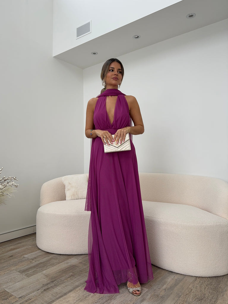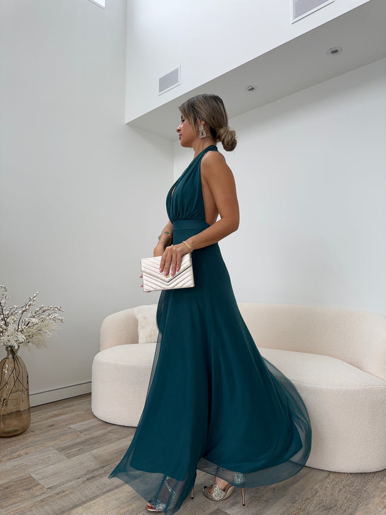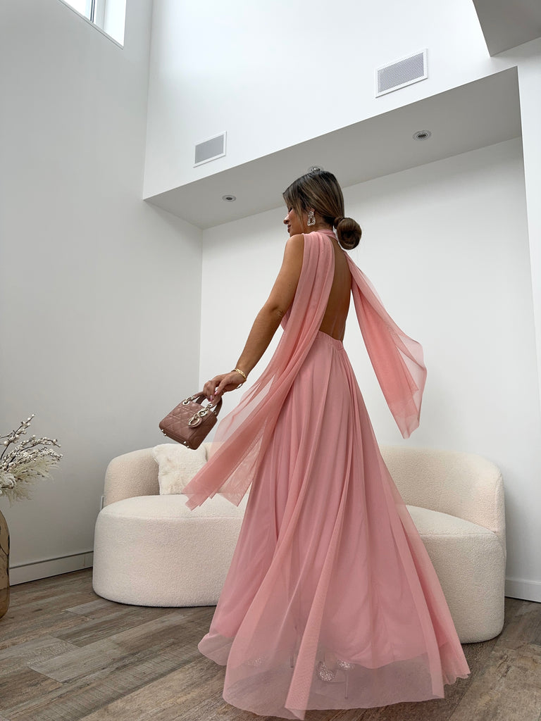 Vestido largo de tul con escote en V y espalda al aire. El vestido tiene copas en la parte del pecho.