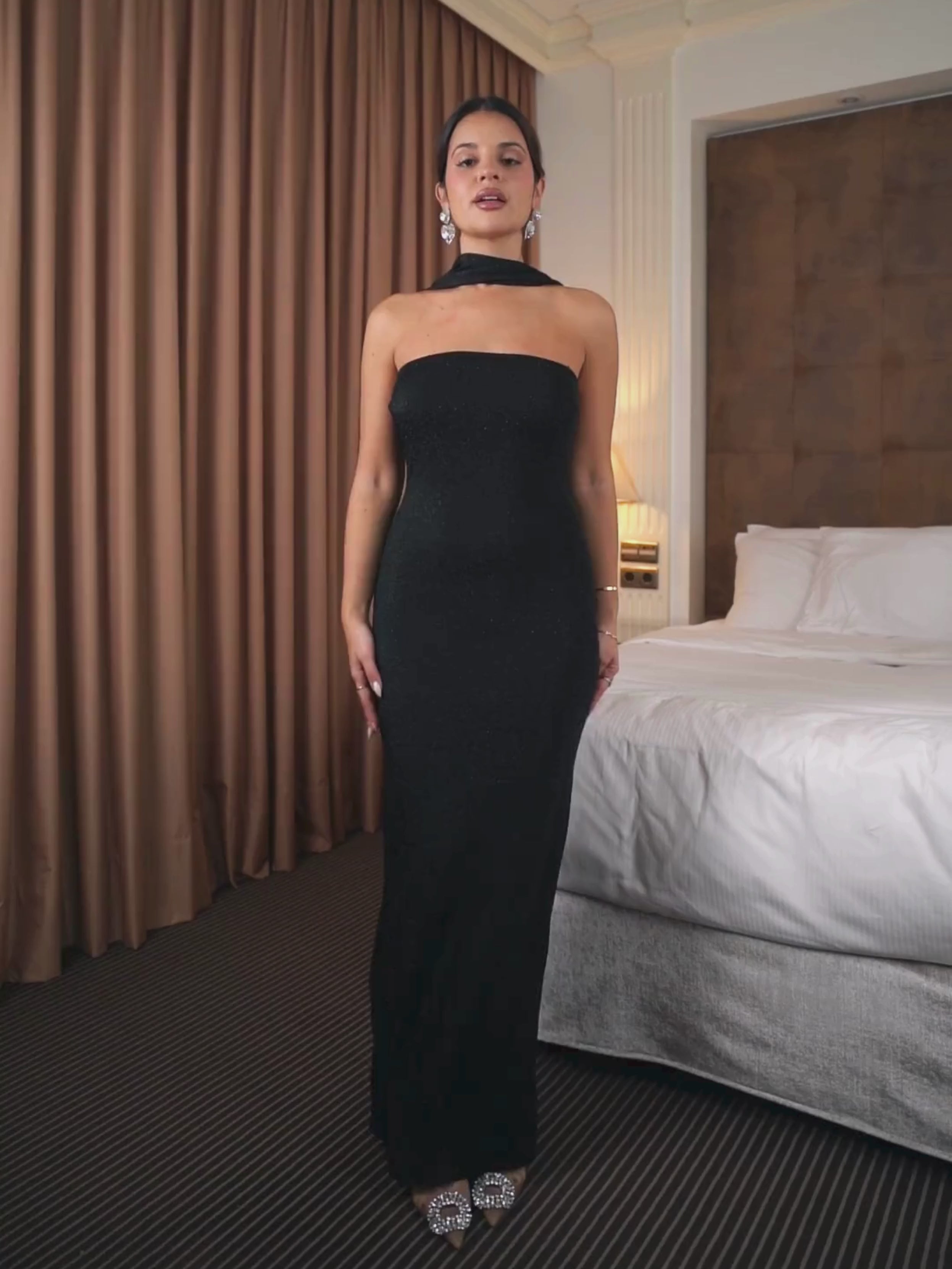 Long dress in glitter fabric with a strapless neckline. It comes with a choker that you can wear in a thousand ways.
