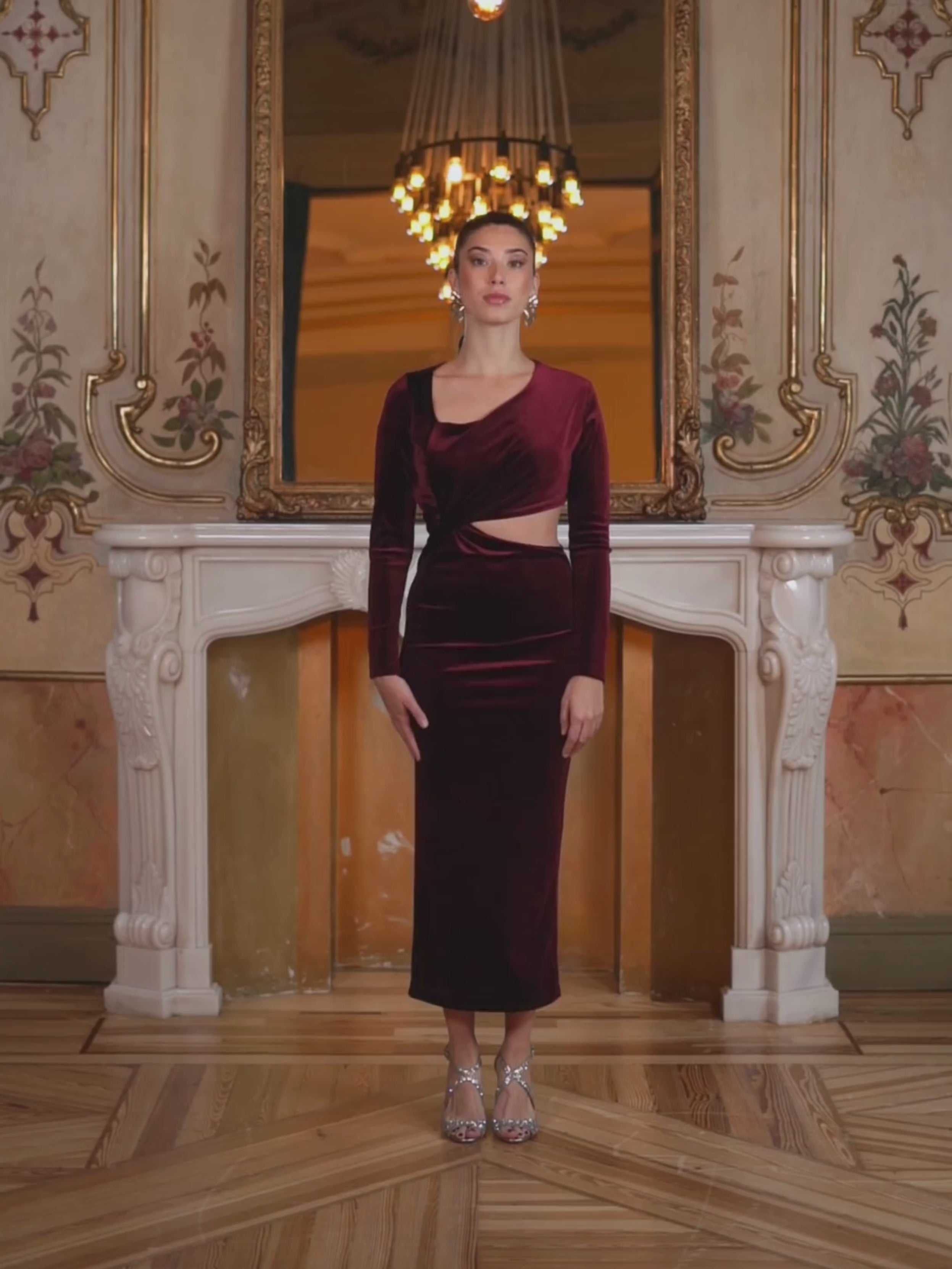Vestido midi de terciopelo con manga larga. Cut out y escote asimétrico