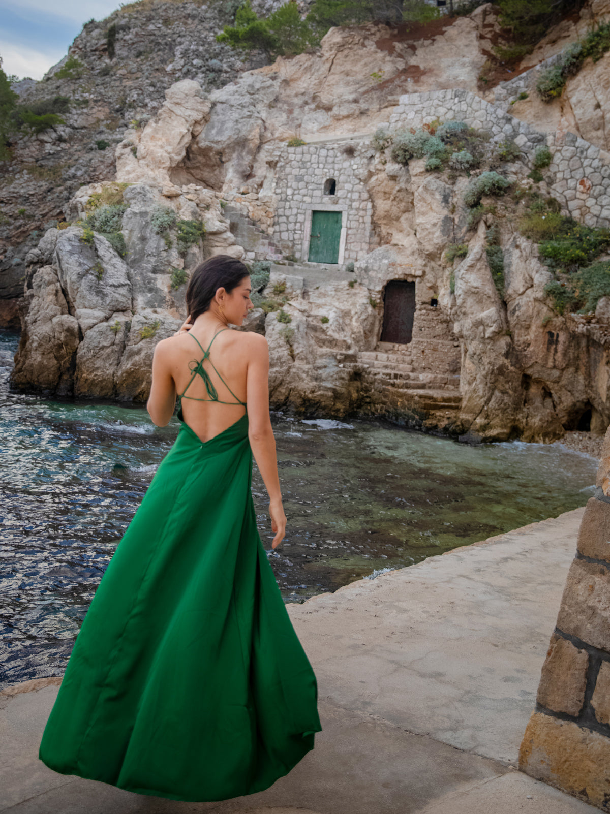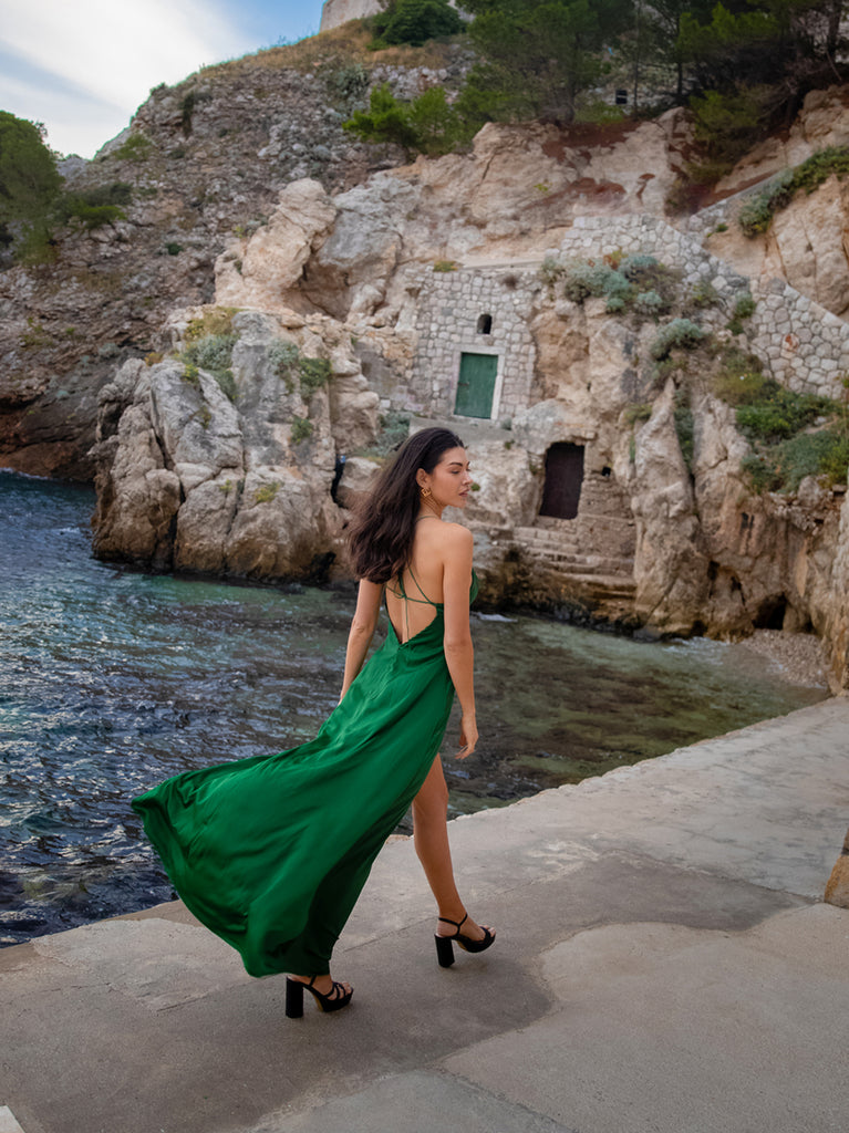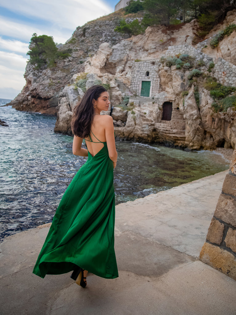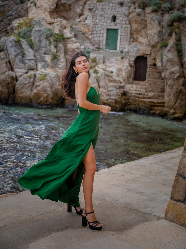 Vestido con espalda descubierta, escote V y apertura frontal en pierna. Ideal para bodas, graduaciones, puestas de largo y otros tipos de eventos. ¡A nosotras nos encanta!